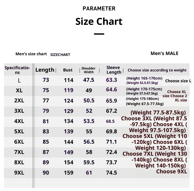 Sizes: M, L, XL, 2XL, 3XL, 4XL, 5XL, 6XL, 7XL, 8XL, 9XL
